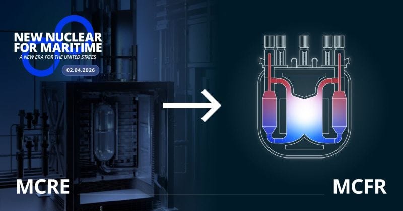 Core Power has gone further into novelty territory here, partnering with TerraPower and HD Hyundai to pursue TerraPower’s Molten Chloride Fast Reactor (MCFR) for marine application. The MCFR proposes to use liquid chloride salt as both fuel and coolant, to operate at fast neutron spectrum, and to run at higher temperatures than conventional reactors. It has progressed from a non-nuclear integrated-effects test, running pumped-salt operations in a laboratory in Everett, Washington, towards a non-power critical experiment at Idaho National Laboratory targeted for approximately 2030.