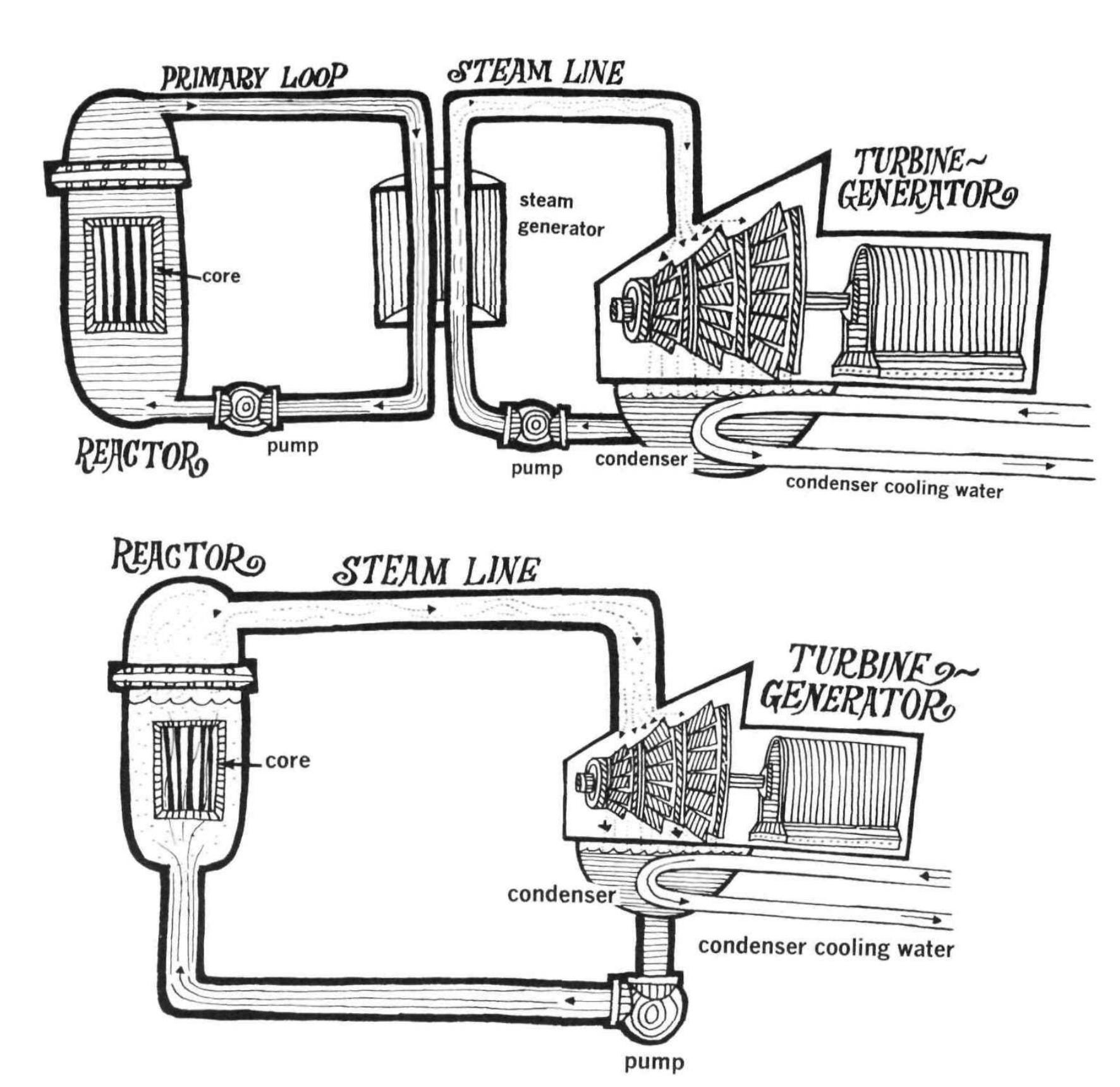 How boiling water reactors (BWRs) function differently from pressurized water reactors (PWRs), with direct boiling in the reactor vessel