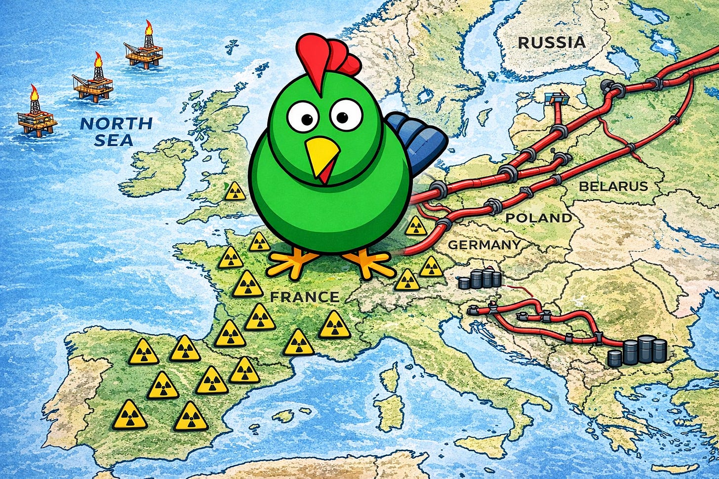 The French nuclear fleet anchored cheap, firm electricity across much of the continent. North Sea output was near its peak. Groningen, the vast Dutch gas field, underpinned Northwest European supply. Europe had a healthy energetic basis. A continent that had been genuinely vulnerable to a Middle Eastern supply cartel in 1973 had, through two decades of serious state-directed and private sector investment, rebuilt the physical foundations of its own security.