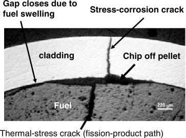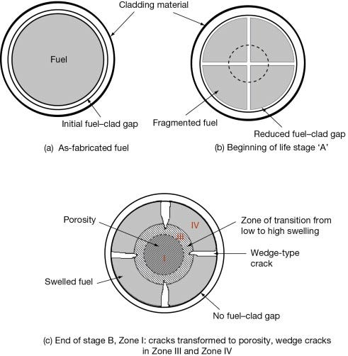 The limiting factor at high burnup is not purely enrichment level or the fuel pellet itself. The UO2 can in principle sustain continued fissioning as long as fissile material remains and the neutron environment supports it. What gives out is the zirconium cladding surrounding the pellet. Two degradation mechanisms are the main concerns. Oxidation of the cladding’s outer surface by the hot pressurized water, carrying dissolved boric acid in PWRs, progressively converts zirconium metal to zirconium oxide and depletes the cladding wall thickness. Hydrogen pickup, where hydrogen liberated by the oxidation reaction diffuses into the cladding metal, forms zirconium hydride precipitates that reduce the material’s ductility, making it brittle and prone to cracking under mechanical stress. Under normal operating conditions these processes are gradual and manageable. Under accident conditions, particularly rapid temperature transients, the embrittled cladding can fracture catastrophically.