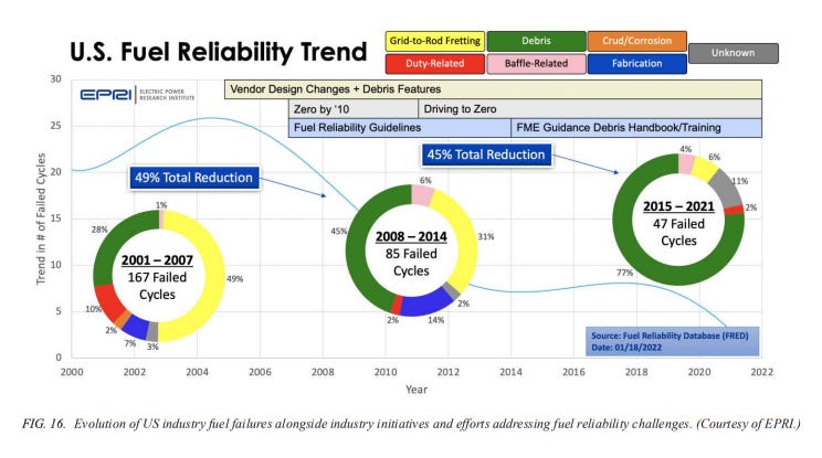 The Zero by 2010 initiative, organized through the Electric Power Research Institute and involving coordinated action across the US fleet and its fuel vendors, targeted exactly this. Foreign material exclusion programs were tightened at every stage of the fuel fabrication and reactor maintenance process. Grid and fuel rod designs were modified to reduce fretting susceptibility. Welding and inspection procedures were revised. And, critically, operators started sharing failure data systematically across the industry rather than treating each incident as a local problem to be quietly resolved.