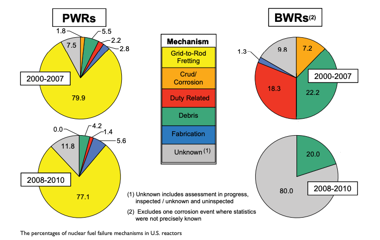 The causes were mostly prosaic. Debris ingress was the dominant mechanism: metal filings, wire bristles from cleaning brushes, small hardware left behind during maintenance, any of which could get lodged between fuel rods and vibrate its way through the soft zirconium cladding over months of operation. Weld defects at the end plugs of fuel pins could allow water ingress, triggering a hydrating reaction that embrittled the cladding. Grid-to-rod fretting, where the structural grids holding the assembly together wore against the fuel pins under flow-induced vibration, produced a class of failures that took years of systematic investigation to understand and address.