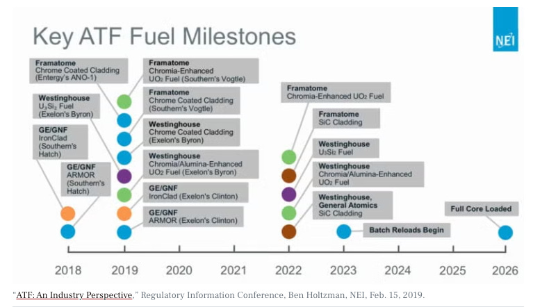 Fukushima refocused the industry’s attention on this second concern. The hydrogen generated by rapid oxidation of zirconium cladding under loss-of-coolant conditions was directly responsible for the building explosions at Fukushima Daiichi. The response was accident-tolerant fuel, or ATF, an umbrella term for fuel designs intended to reduce the rate of cladding oxidation and hydrogen generation under severe accident conditions, buying more time for operators and emergency systems to respond before the situation becomes irretrievable.