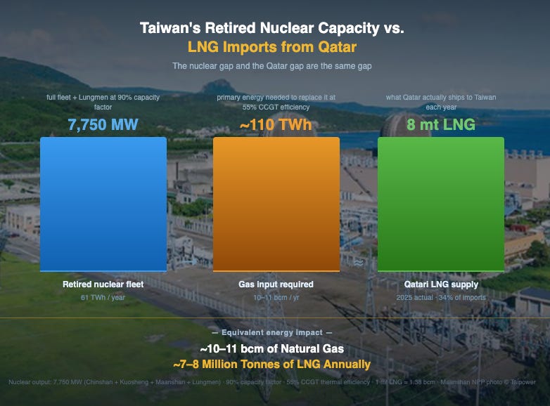 In other words, the nuclear fleet Taiwan shut down would have displaced essentially the entire Qatari supply stream.